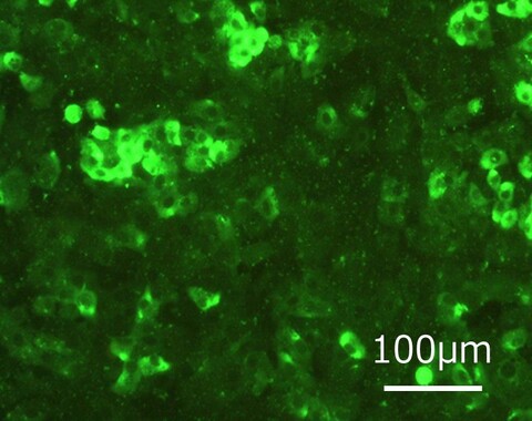 培養細胞内で増殖している新型コロナウイルスのスパイクタンパクにダチョウ抗体が結合すると緑色蛍光として可視化される(FITC標識ダチョウ抗体を用いた免疫蛍光抗体法)。